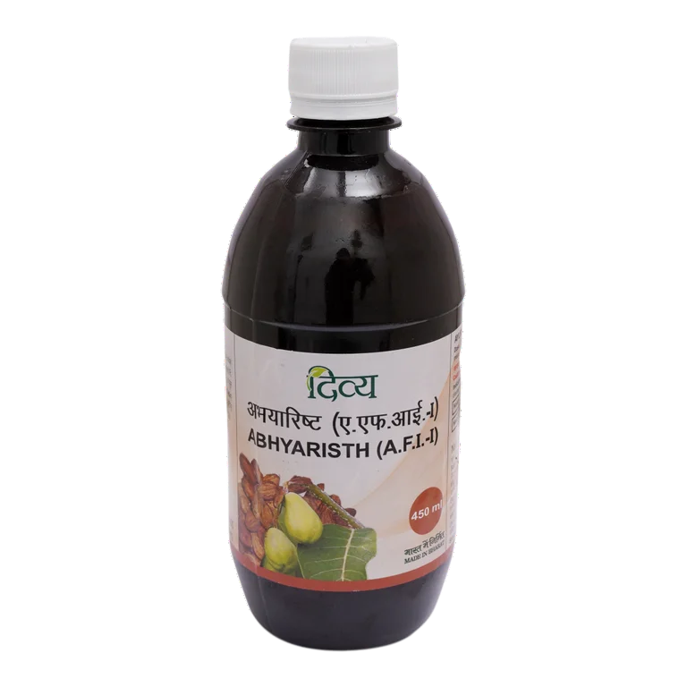 Divya Abhyaristh contains Harad (Terminalia chebula), Munnaka (Vitis vinifera), Mahua (Madhucaindica), Vaividang (Embeliaribes), Gudd (Jaggery), Gokhru (Tribulus Terrestris), Nisoth(Operculinaturpetum), Dhaniya (Coriandrumsativum), Dhaiful (Woodfordiafruticosa), Indrayanmul(Citrulluscolocynthis), Chavya (Piper retrofractum), Saunth (Zingiberofficinale), Dantimul (Baliospermummomtanum), and Mochras (Salmaliamalabarica) as major ingredients.
